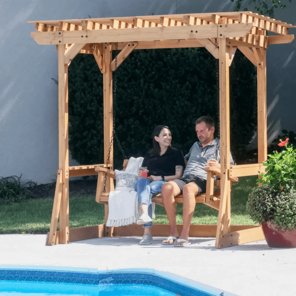 Crafted from 100% durable cedar wood, this classic pergola swing blends timeless aesthetics with superior strength. Featuring pre-cut and pre-drilled lumber for easy assembly, you can enjoy relaxation without the hassle. With a 600 lbs. weight capacity, this two-person swing provides a sturdy and serene way to unwind for years to come.